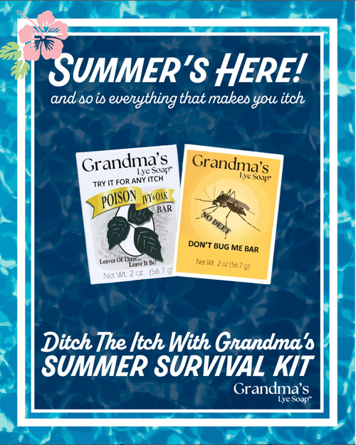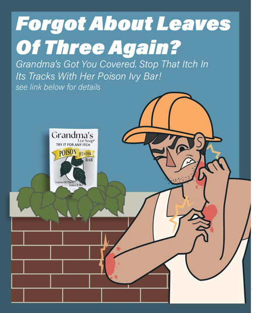 If exposed, wash contact areas well with cool water and GRANDMA’S Poison Ivy Bar to remove poison oils. (Cool water keeps the pores closed reducing the likelihood that the oils will penetrate the skin.) If rash develops wash & rinse affected areas with Poison Ivy Bar and then pat a little lather on the rash and leave on to dry, which will stop the itch immediately. Repeat as necessary to control itch, including itch from bug bites. (Lather dries clear and won't stain fabrics.) Colloidal oatmeal also helps calm inflamed irritated skin.